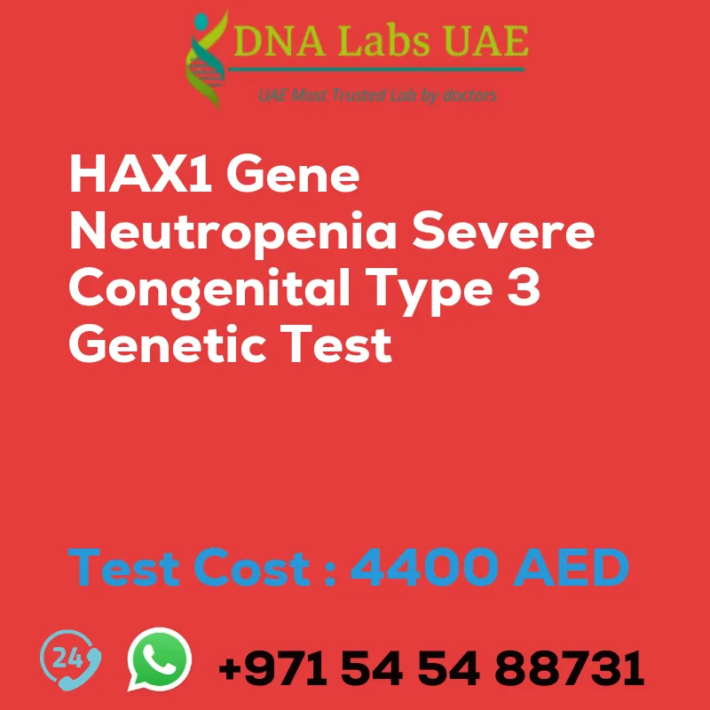 The cost of the HAX1 Gene Neutropenia Severe Congenital Type 3 Genetic Test at DNA Labs UAE is 4400 AED. This investment covers the comprehensive analysis necessary to accurately diagnose this condition, guiding families and healthcare providers in making informed decisions regarding the care and treatment of patients with SCN3.