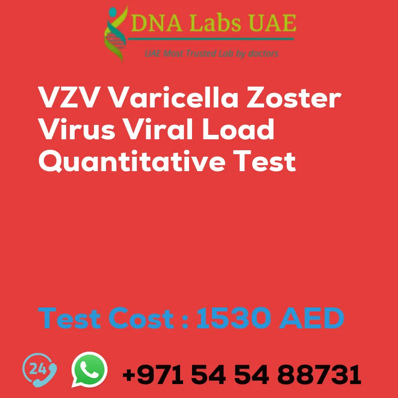The VZV Varicella Zoster Virus Viral Load Quantitative Test is priced at 1530.0 AED. The test can be performed on various sample conditions, including serum, plasma, whole blood, saliva, C.S.F., lymph node biopsies, swabs of vesicles, swabs of papules, swabs of crusts, and crusts.